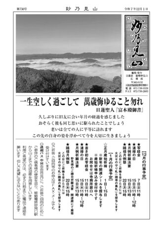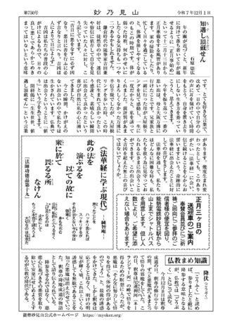 開経偈に「生生世世、値遇し頂戴せん」という言葉があります。幾度生まれ変わったとしても、このありがたい「法華経」に会い、信じ続けることを心からお誓いますという、奇跡的に法華経に出会えたことに対しての喜びをさします。 法華経を通して、私たちはどんなに困難な時も、私たちを救う為に見守っておられる仏さまに出会うことができます。この出会いこそ吉凶を超えた無上の喜びではないでしょうか。