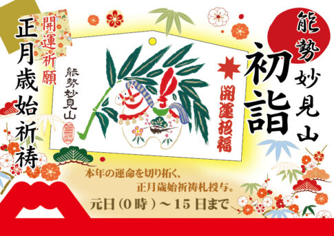 ★歳始祈祷~元旦(0時)~15日まで 開運隆昌、家内安全、交通安全、身体健全、受験合格など開運招福のご祈祷を行います。運命を切り拓く「正月歳始祈祷札」授与。 ◆受付時間 ・大晦日~正月1日は終日受付(12/ … » 続きを読む