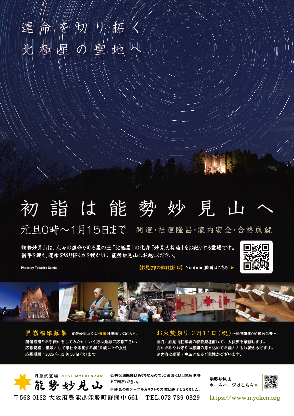 | 新年を迎え正月十五日間、恒例の正月歳始祈祷を厳修致します。期間中、相当混雑が予想されますので、前もってお申し込み頂ければ幸いに存じます。 詳しくは能勢妙見山072-739-0991まで。
